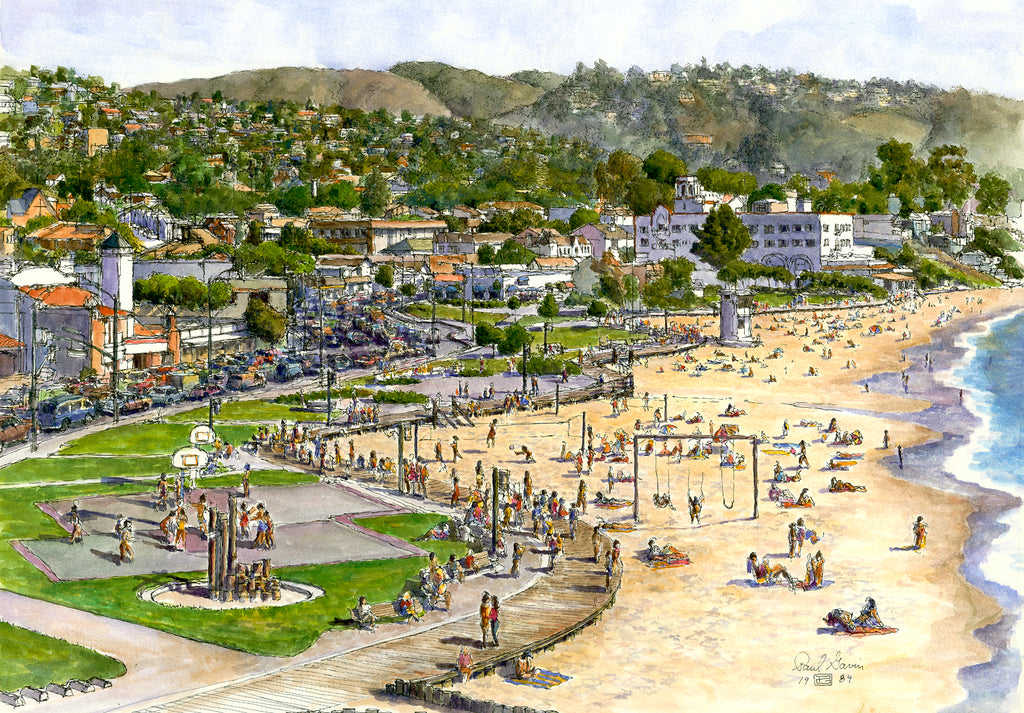 The very positive response to Final Match: Laguna Beach Volleyball pushed me to create this pen and ink watercolor of Main Beach. Up until that time, artists painted Main Beach from Las Brisas, or further west. By now focusing on the volleyball games a new and closer Main Beach perspective was created, making the actual Main Beach more expansive.
